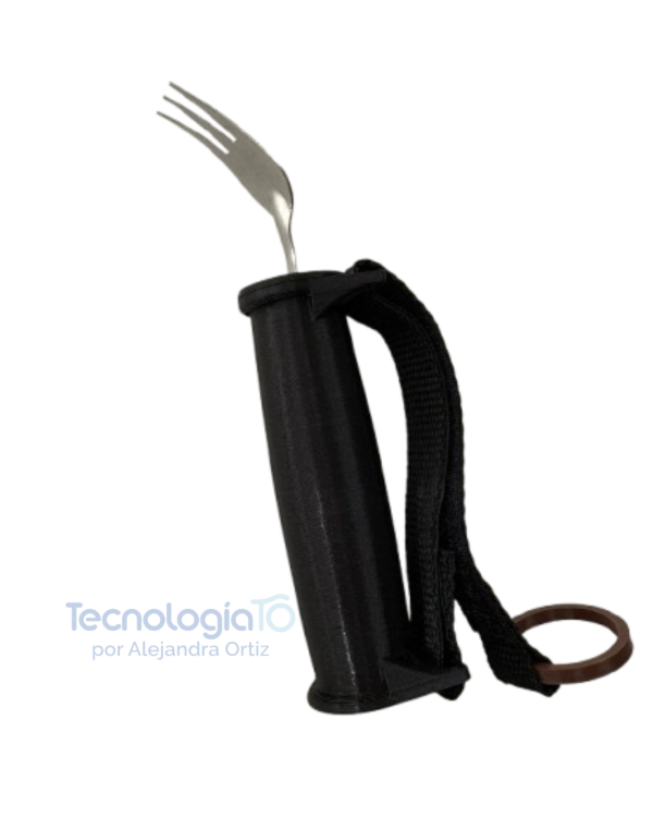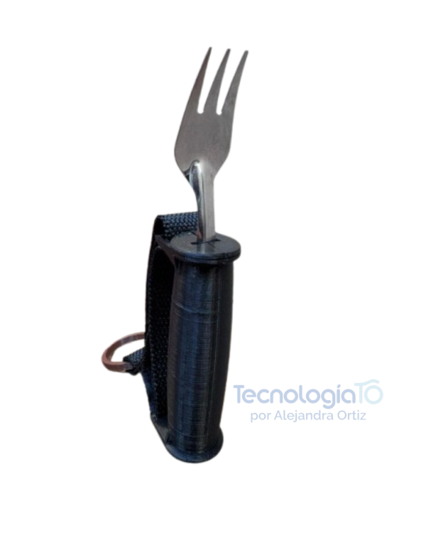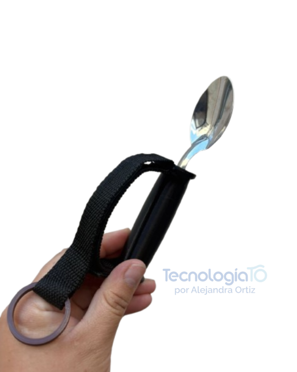 Cubiertos adaptados diseñados para favorecer la independencia en la alimentación de niños y niñas con dificultades de prensión o control motor. Incluyen una banda ajustable al tamaño de la mano, que permite mantener el cubierto sujeto sin necesidad de fuerza o agarre fino.